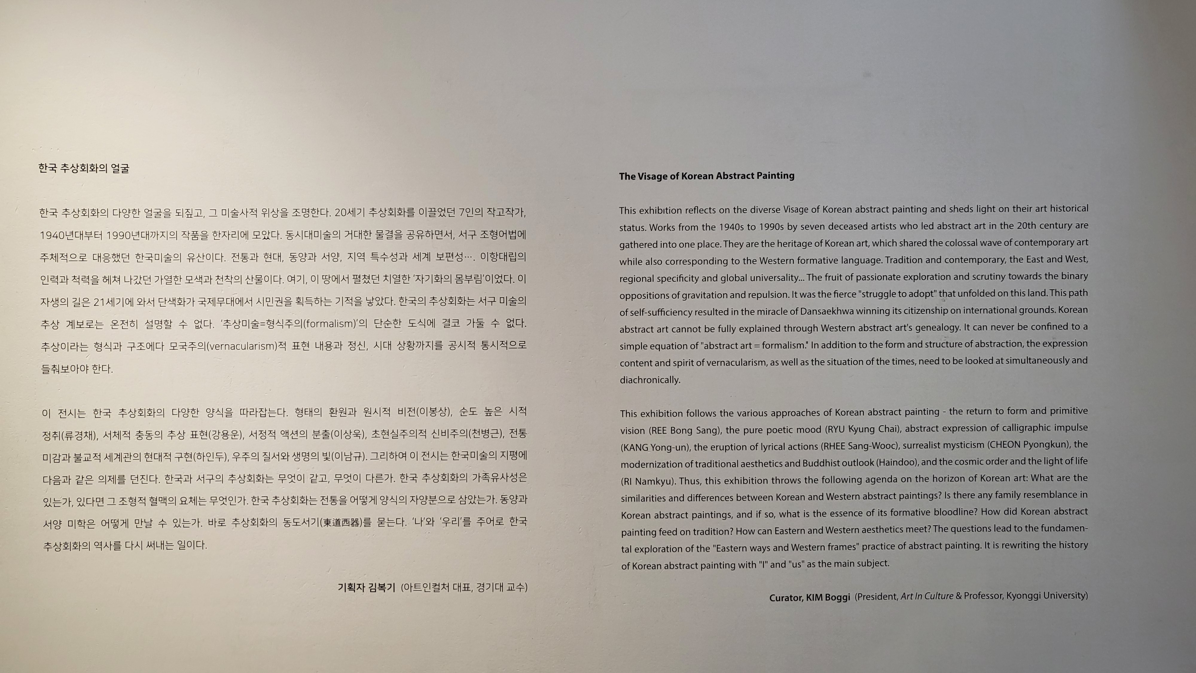 한국 추상회화의 다양한 얼굴을 되짚고, 그 미술사적 위상을 조명한다. 20세기 추상회화를 이끌었던 7인의 작고작가, 1940년대부터 1990년대까지의 작품을 한자리에 모았다. 동시대미술의 거대한 물결을 공유하면서, 서구 조형어법에 주체적으로 대응했던 한국미술의 유산이다. 전통과 현대, 동양과 서양, 지역 특수성과 세계 보편성…. 이항대립의 인력과 척력을 헤쳐 나갔던 가열한 모색과 천착의 산물이다. 여기, 이 땅에서 펼쳤던 치열한 ‘자기화의 몸부림’이었다. 이 자생의 길은 21세기에 와서 단색화가 국제무대에서 시민권을 획득하는 기적을 낳았다. 한국의 추상회화는 서구 미술의 추상 계보로는 온전히 설명할 수 없다. ‘추상미술=형식주의(formalism)’의 단순한 도식에 결코 가둘 수 없다. 추상이라는 형식과 구조에다 모국주의(vernacularism)적 표현 내용과 정신, 시대 상황까지를 공시적 통시적으로 들춰보아야 한다.