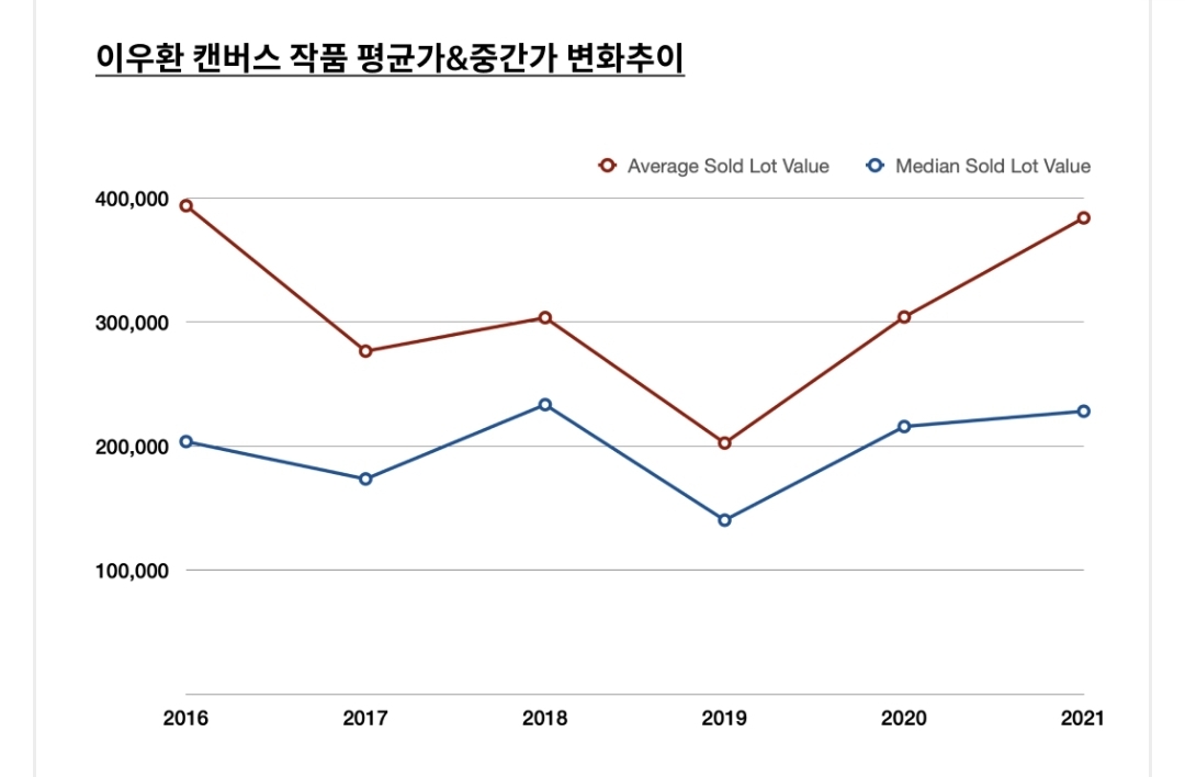 ② 캔버스 작품 평균가 및 중간가 상승 추이