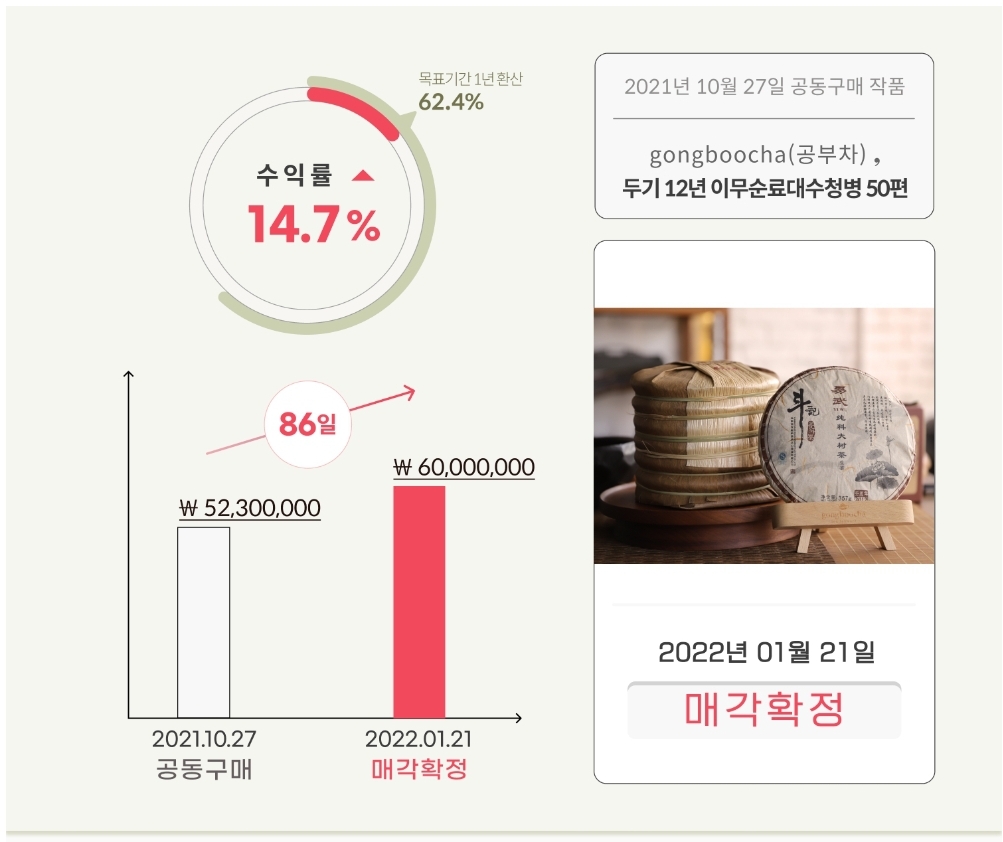 공동구매 참여하려고 했는데 손이 늦어 놓치고 말았는데, 약 3개월만에 14.7% 수익으로 팔렸습니다.