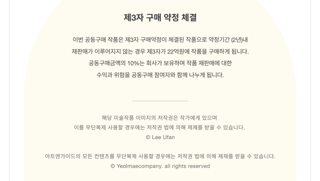 약정 기간인 2년동안 재판매가 이루어지지 않는 경우 제 3자가 22억원(10% 상승)에 작품을 구매한다고 하네요.