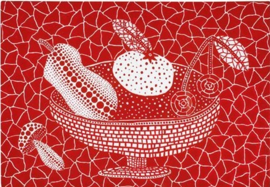 쿠사마 야요이만의 독특한 화풍으로 우리가 알던 일반적인 정물화는 아니지만 바구니에 담긴 과일에서 입체감이 느껴지는 것 같은 작품입니다.