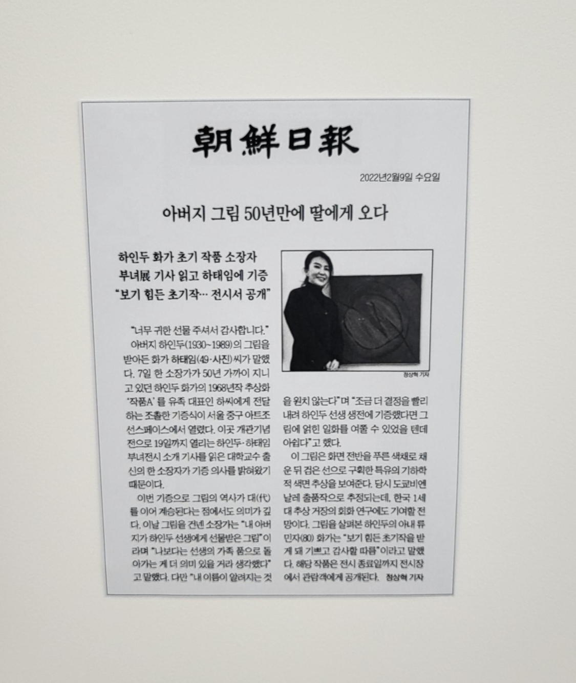 조선미디어그룹 유일의 아트 전문 매체 <아트조선>은 대한민국 문화지형도 중심인 서울 광화문에 동시대 예술 복합 문화 플랫폼 '아트조선스페이스'를 2022년 1월 개관한다. 이에 2022년 상반기 동안 개관 특별 기획전 시리즈를 연속적으로 선보인다. 개관전 시리즈의 첫 주자는 하인두(1930-1989)와 하태임(b.1973) 두 작가의 부녀전 <<잊다, 잇다, 있다>>로 1월 20일부터 2월 19일까지 열린다.