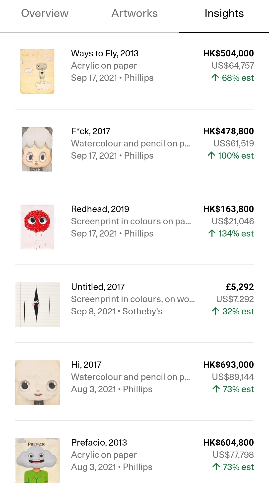 최근에 판매된 작품의 가격과 상승률을 일부 찾아본 것으로 상승률 엄청난 것을 알 수 있습니다.