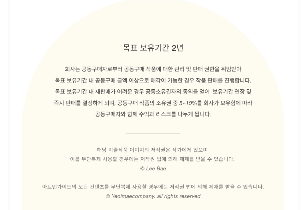 이 작품의 목표 보유기간은 2년으로 작품 소유권의 5~10%를 아트앤가이드에서 보유하게 됩니다.