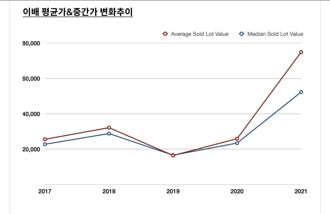 ① 작품 평균가 및 중간가의 비약적 상승 추이