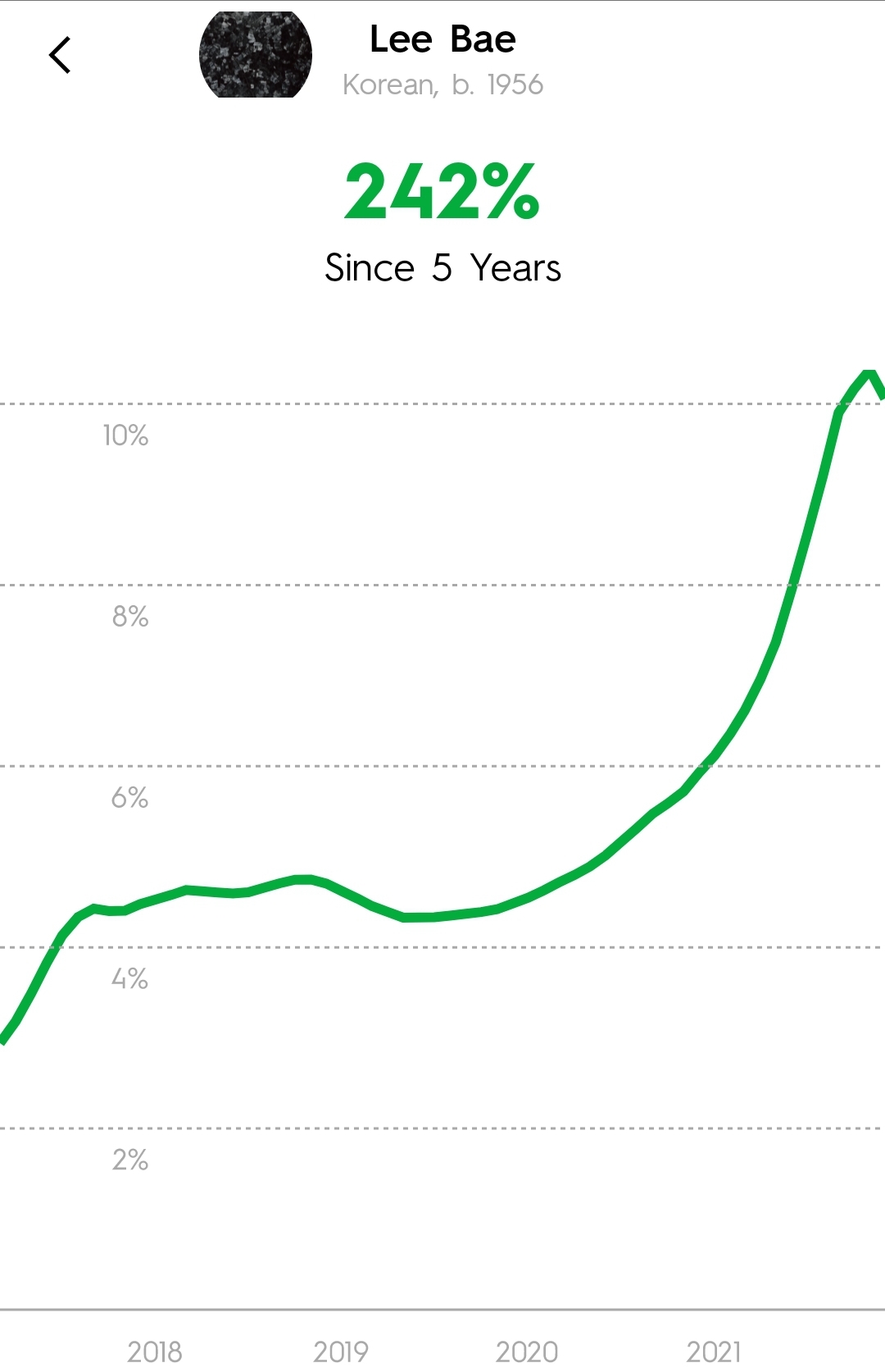 LiveArt에 의하면 지난 5년간 이배 작가님의 작품은 242% 상승했습니다.
