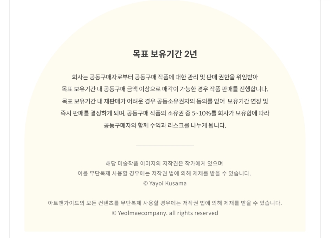 보통 2년의 작품 보유 기간을 설정하게 되는데 2년이 지난 경우 공동소유권자의 투표를 통해 보유기간을 연장하거나 즉시 판매 중에 선택을 하게 된다고 합니다. 그리고 10억이 넘는 작품 가격 때문인지 아트앤가이드에서 5~10%의 소유권을 보유하여 공동구매 참여자와 같은 운명(?)으로 수익과 리스크를 나눠 가진다고 합니다.