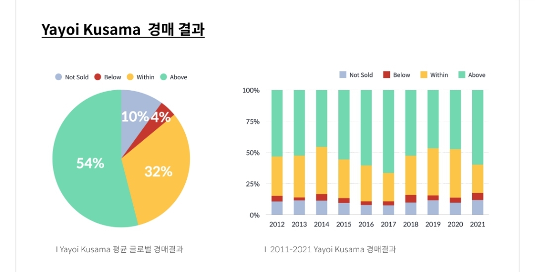 그간 쿠사마 야요이님의 작품 경매 결과를 보면 유찰율이 낮고 작품 추정가보다 높게 경매 입찰이 된 것으로 보입니다. 2021년의 경우에도 낙찰률이 88% 이상입니다.