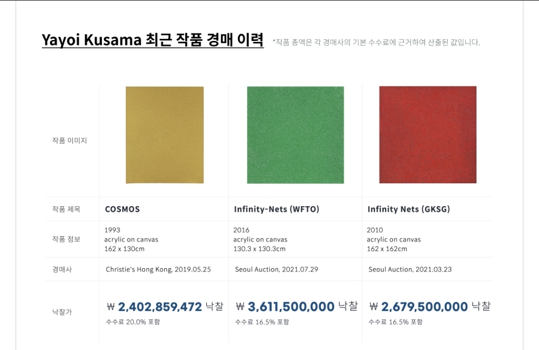 쿠사마 야요이님은 올해 예술 시장에서도 핫한 작가입니다. 최근에 이루어진 작품 경매 가격을 보면 무시무시하네요.