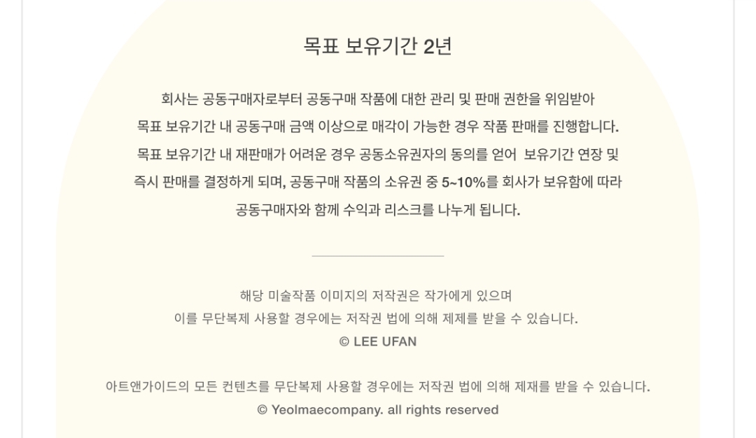 이 작품의 목표 보유기간은 2년이며, 이 작품의 소유권 중 5~10% 아트앤가이드에서 보유하게 됩니다.