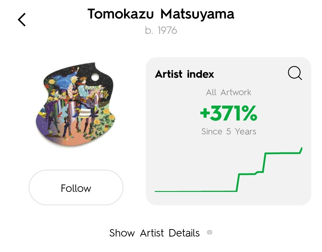 LiveArt에 의하면 지난 5년간 토모카즈 마츠야마님의 아티스트 지수는 371% 상승한 것을 알수 있습니다.