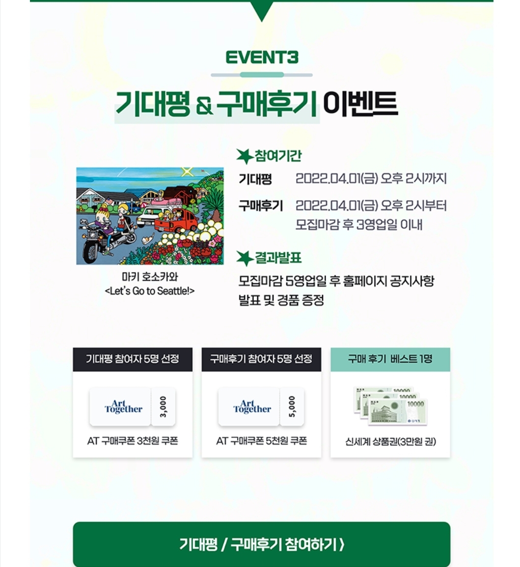 아트투게더에서는 1) 1플랫폼 이용료 1% 구매 이벤트, 2) 10조각 이상 구매시 갤러리 카페 모든 음료 1잔 무료 제공, 3) 기대평&구매후기 이벤트를 진행합니다.