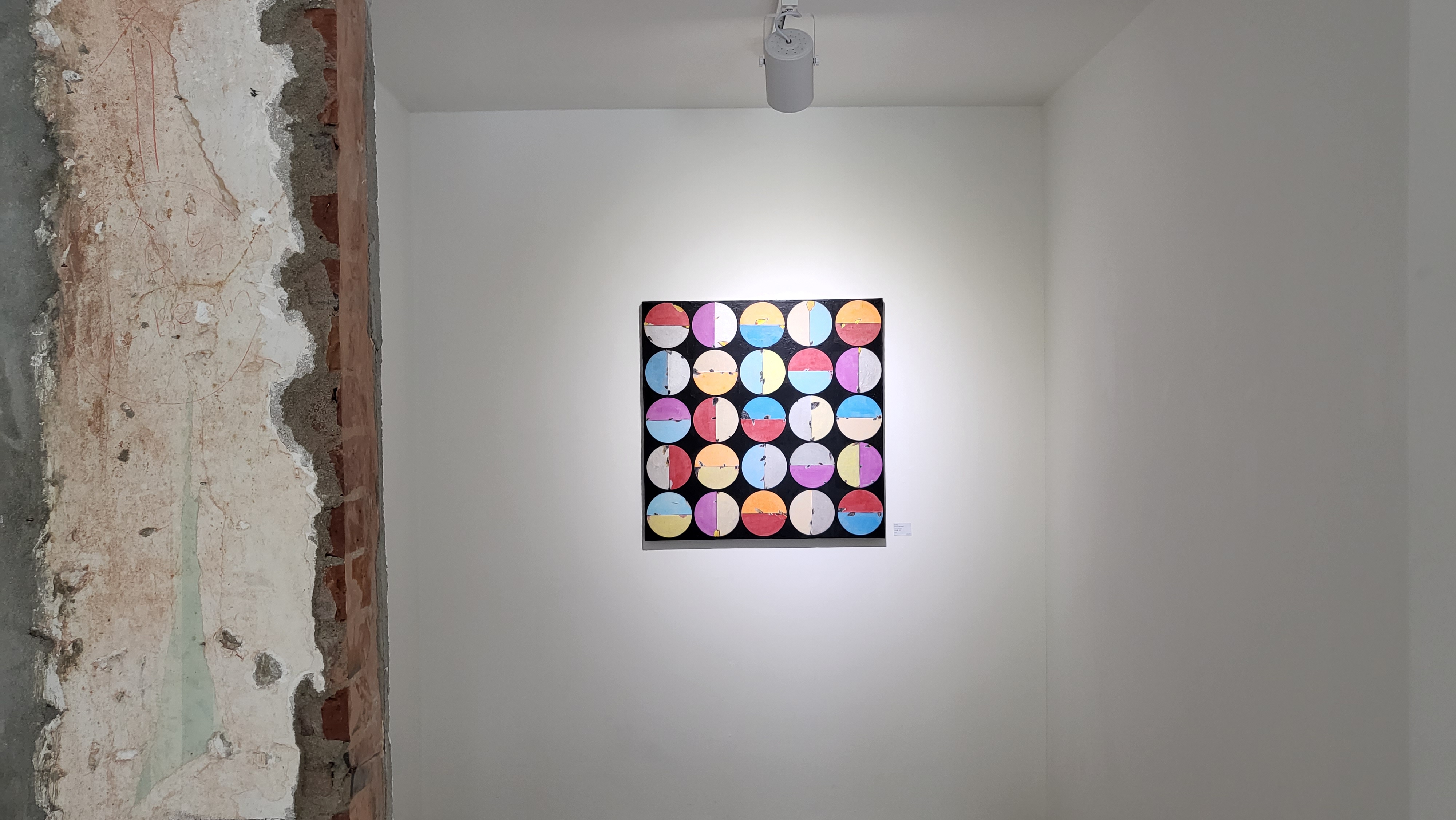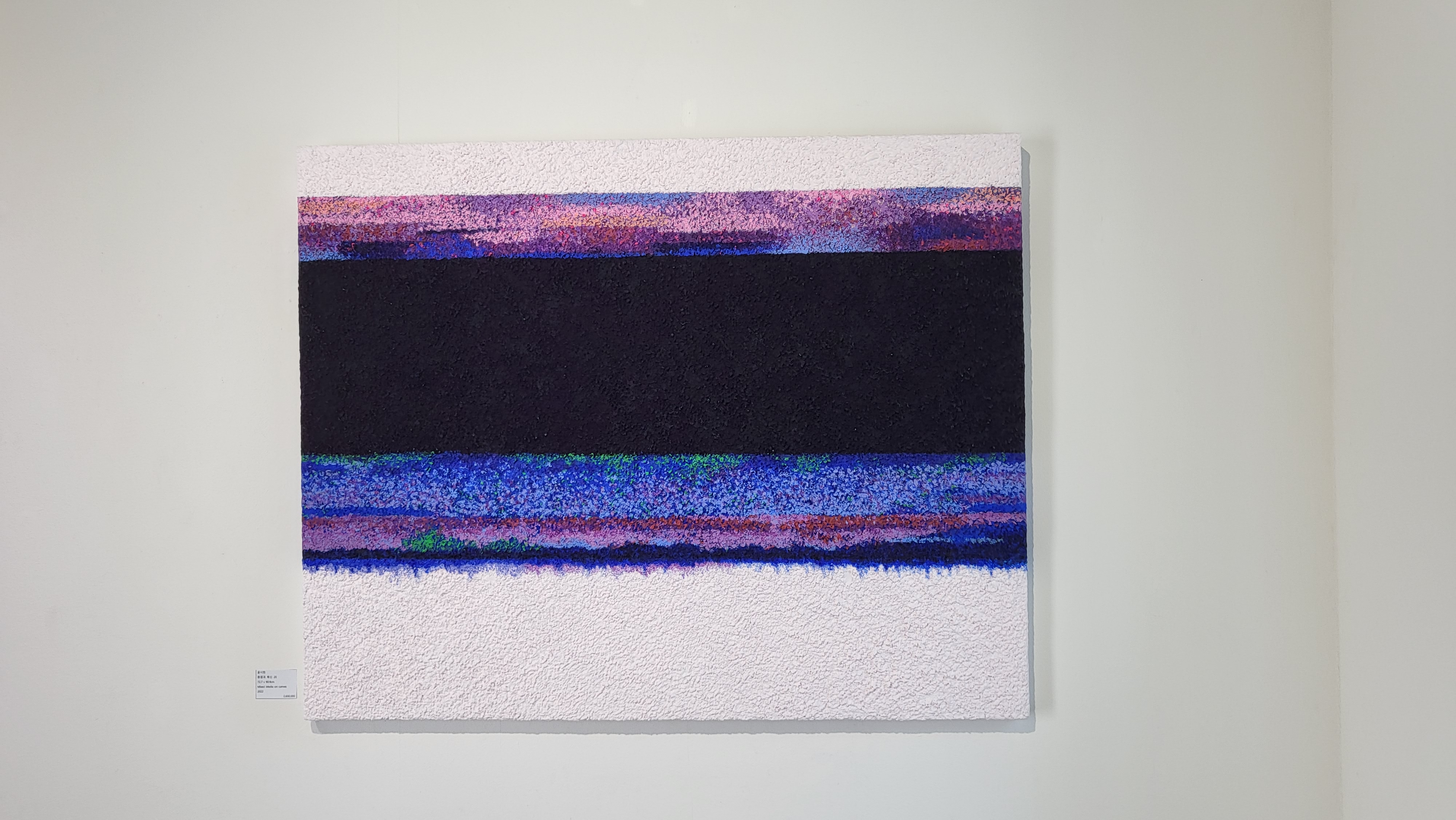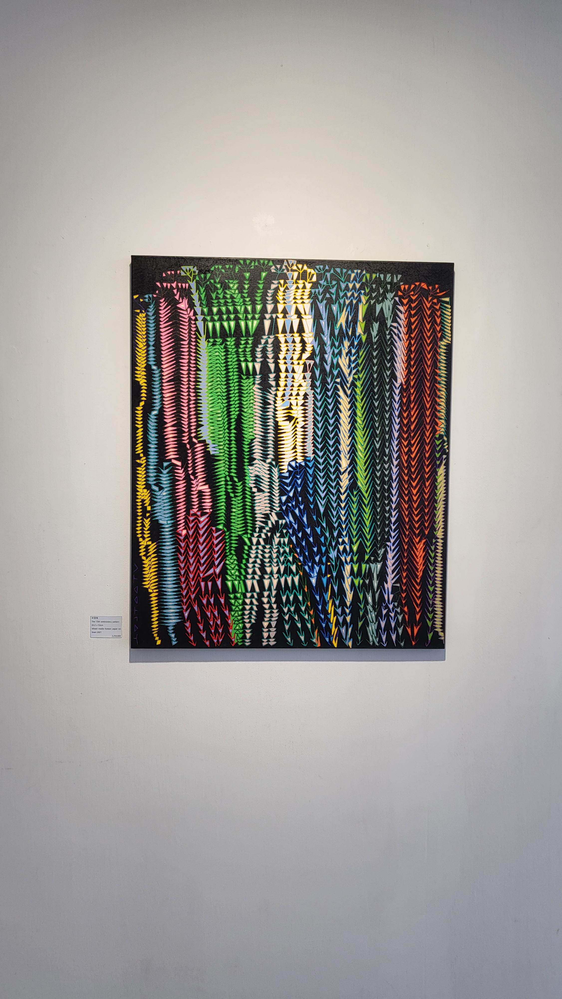 한가지를 오려 캔버스에 점착되는 시간과 흩어짐을 통해 변화를 나타냈고, 한지가 뜯겨지고 물감이 덮이는 반복을 통해 변화, 질서와 균형을 나타탰다.