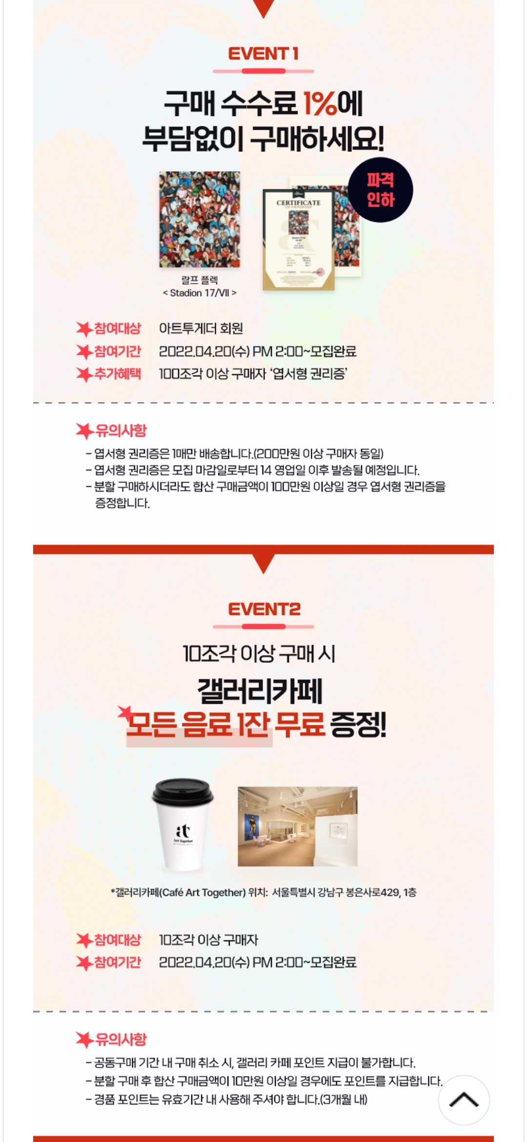 아트투게더에서는 1) 1플랫폼 이용료 1% 구매 이벤트, 2) 10조각 이상 구매시 갤러리 카페 모든 음료 1잔 무료 제공, 3) 기대평&구매후기 이벤트를 진행합니다.