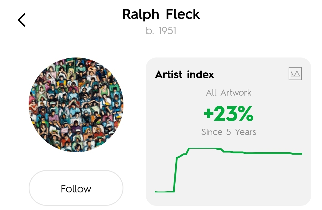 LiveArt에 의하면 지난 5년간 랄프 플렉/Ralph Fleck 아티스트 지수는 23% 상승했습니다.