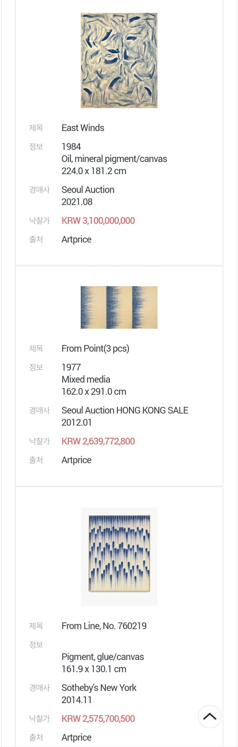 이우환 화백의 경매 낙찰 작품 Top 3입니다.