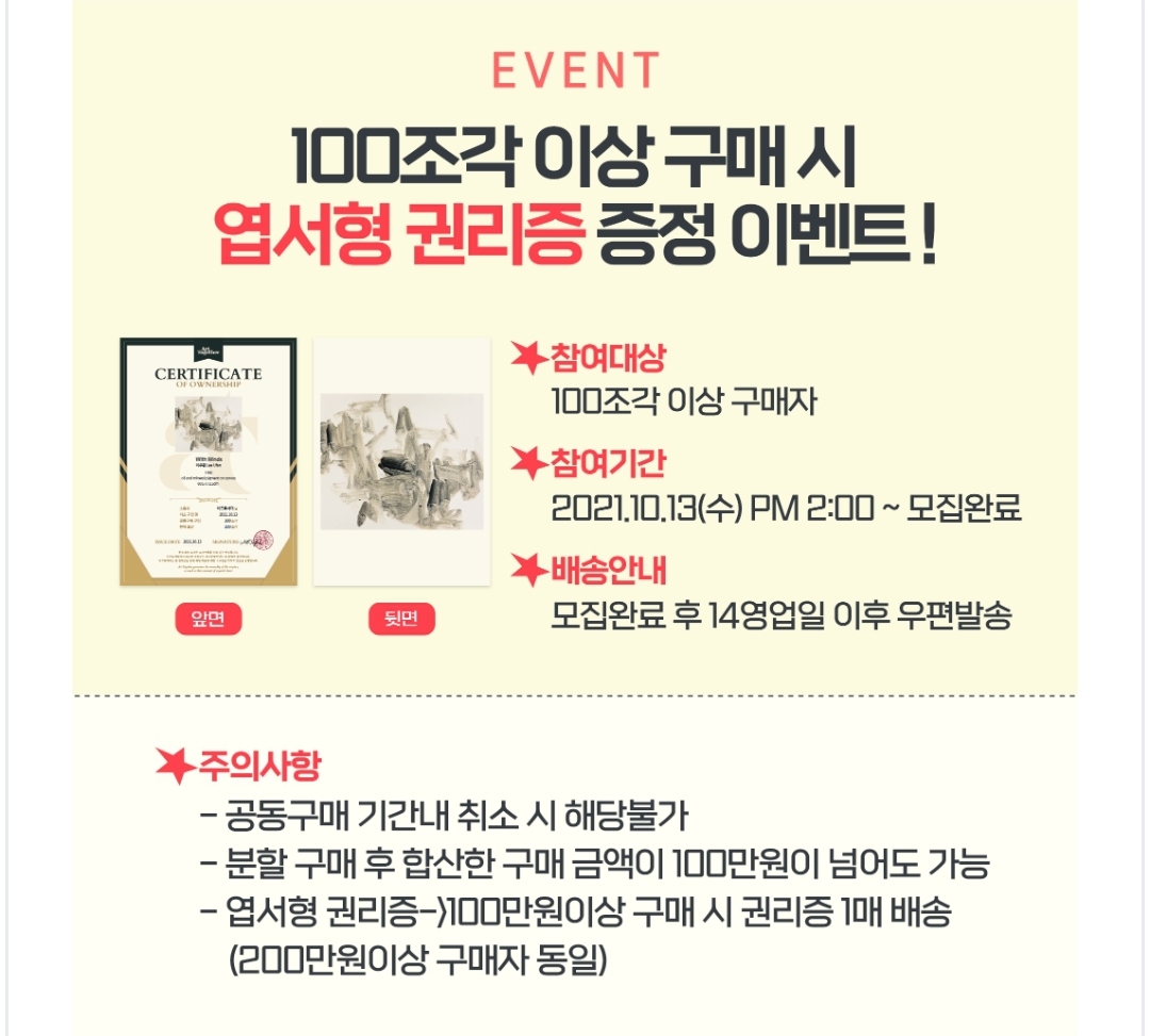 1) 100조각(100만원) 이상 구매 시 엽서형 권리증을 증정하는 이벤트와 2)공동구매 기대평 및 구매 후기 이벤트가 있습니다.