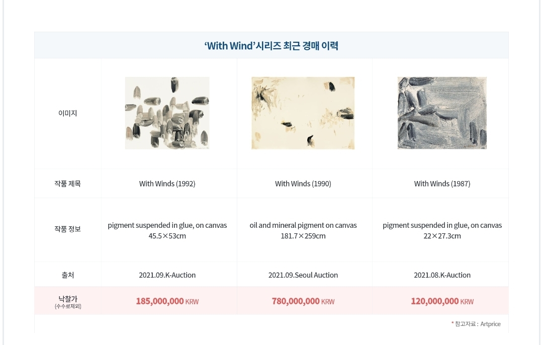With Wind 바람 시리즈 경매 이력과 유사 작품 추이를 보면 3년만에 71%의 가격상승률을 보여주고 있어 놀라울 따름입니다.