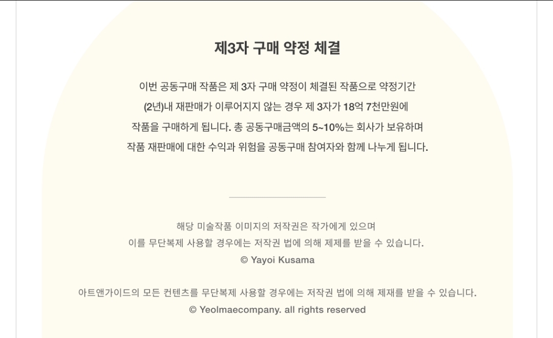 'Nets' 작품의 경우 제 3자 구매 약정이 체결되어 있어 2년내 재판매가 이루어지지 않으면 제3자가 18억 7천만원에 작품을 구매할 예정입니다.