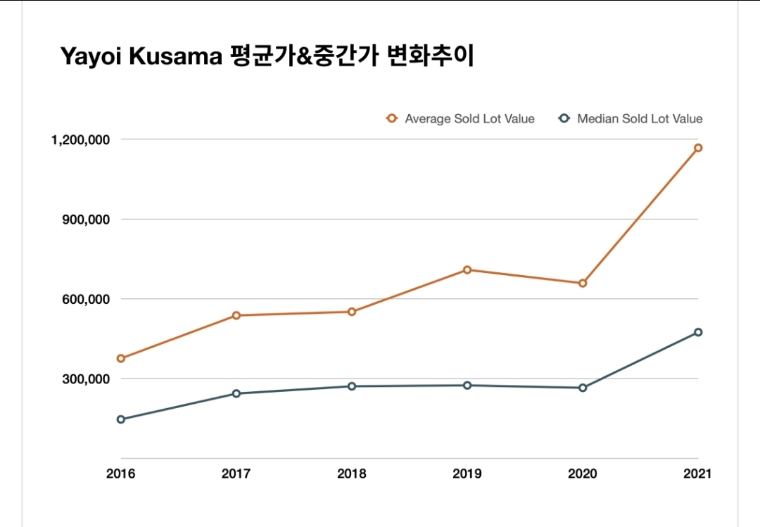 ③ 쿠사마 야요이 작품의 평균가 및 중간가 변화 추이