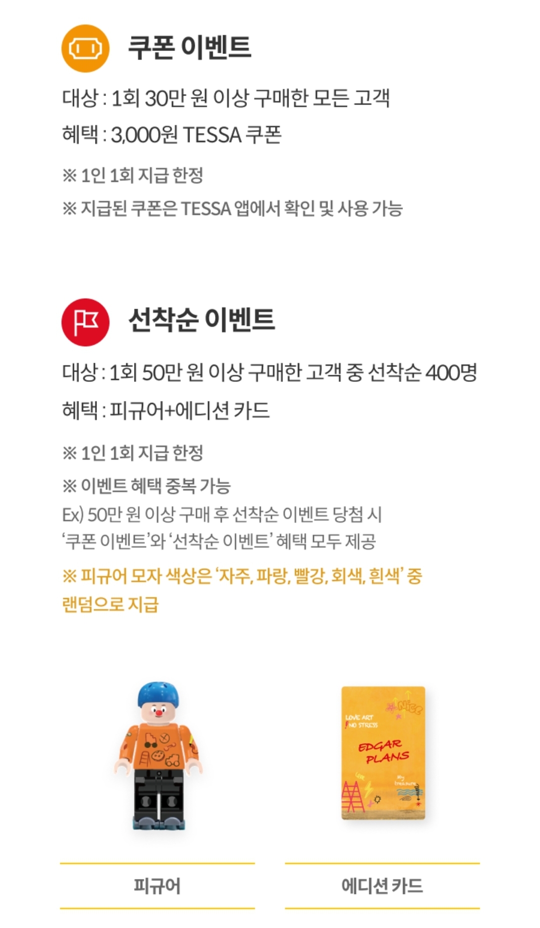 테사/TESSA에서는 1) 1회 30만원 이상 구매 고객에게 3,000원 쿠폰 증정, 2) 1회 50만원 이상 구매 고객 중 선착순 400명에게 피규어+에디션 카드 증정 이벤트를 진행합니다.