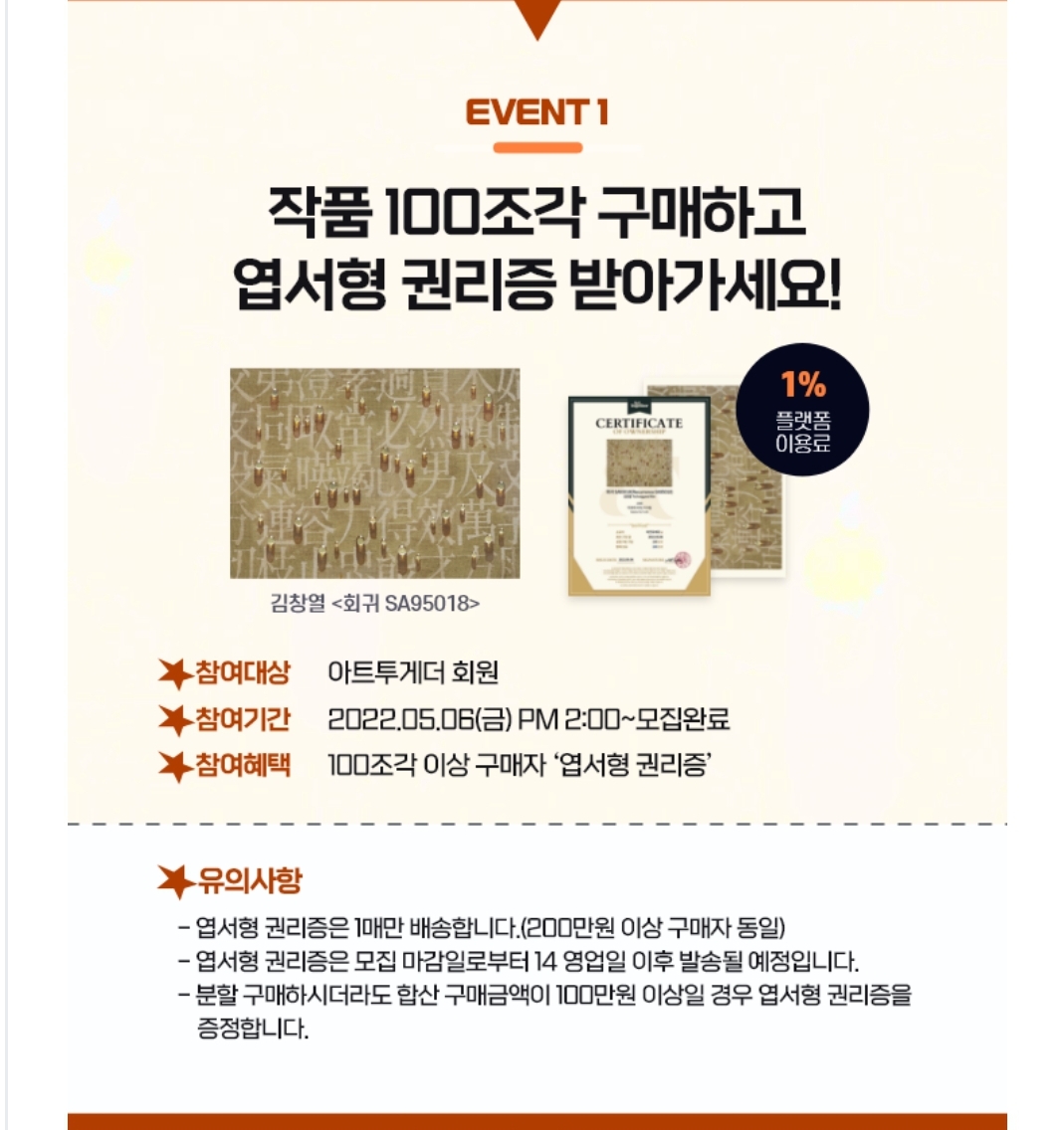 아트투게더에서는 1) 플랫폼 이용료 1%로 공동구매 작품 구매, 2) 100조각 이상 구매자 대상 추첨하여 신세계 상품권 증정, 3) 기대평&구매후기 이벤트를 진행합니다.