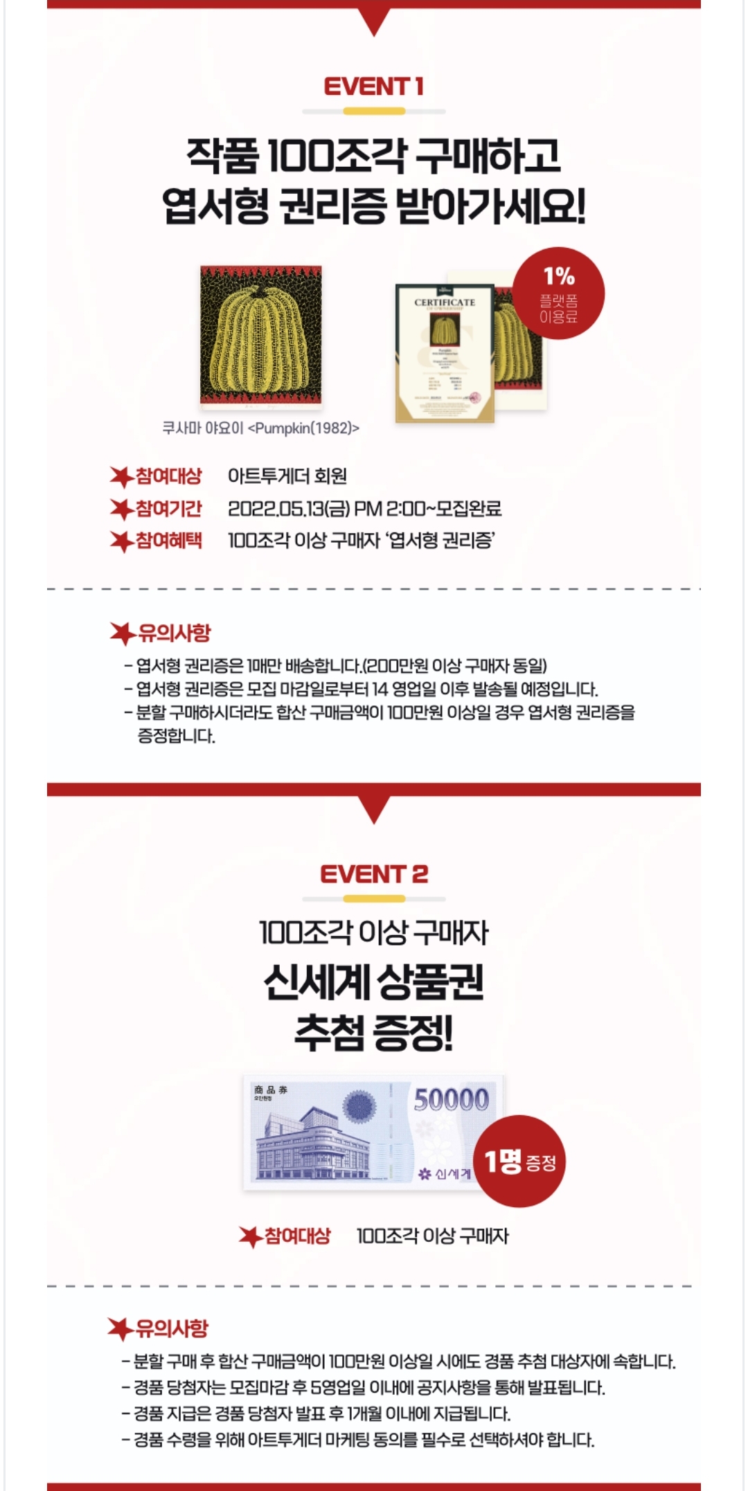 아트투게더에서는 1) 100 조각 이상 엽서형 권리증 증정, 2) 100조각 이상 구매자 대상 신세계 상품권 추첨 증정, 3) 기대평&구매후기 이벤트를 진행합니다.