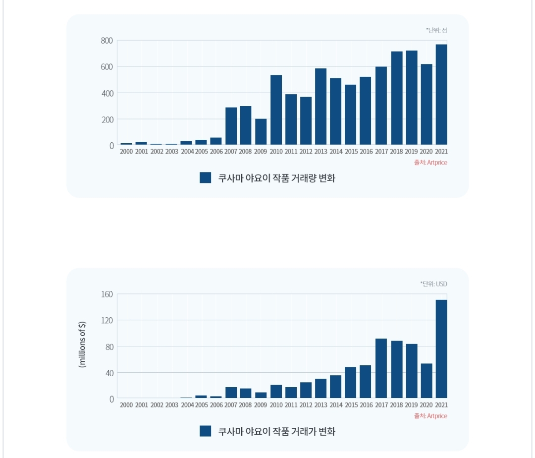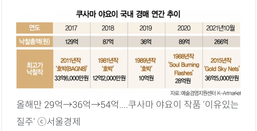 LiveArt에 의하면 지난 5년간 쿠사마 야요이님의 아티스트 지수는 119% 상승한 것을 알수 있습니다.
