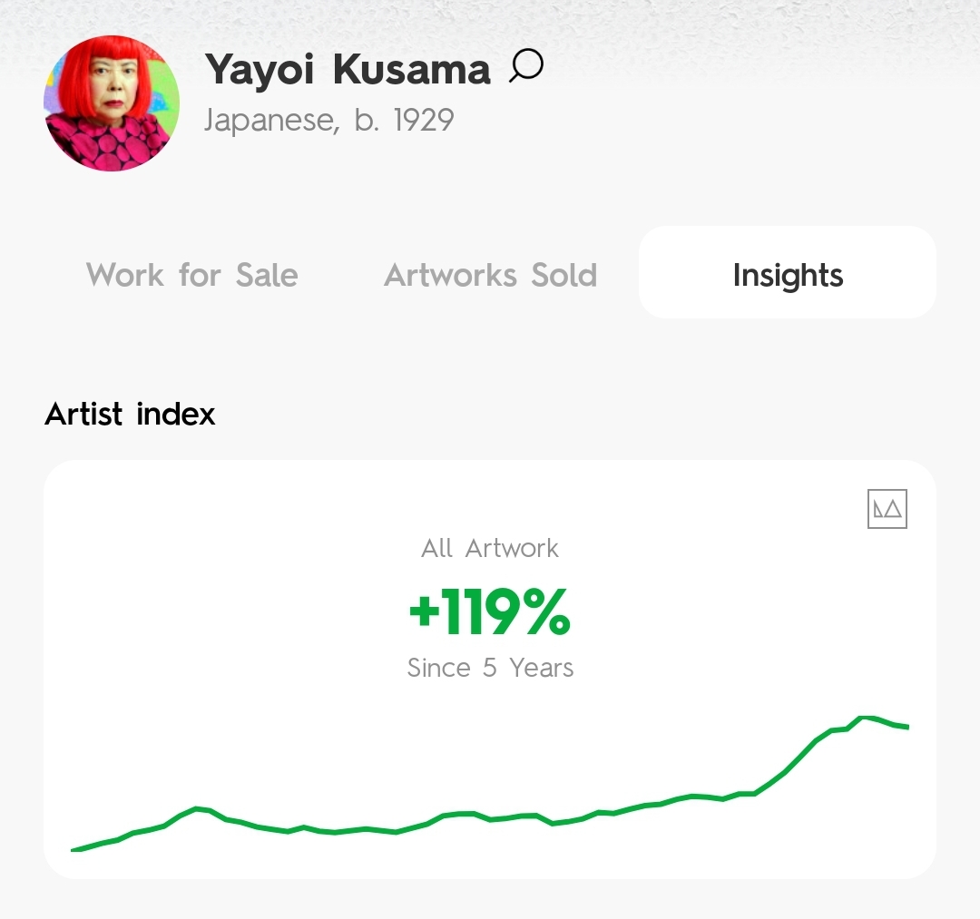 LiveArt에 의하면 지난 5년간 쿠사마 야요이님의 아티스트 지수는 119% 상승했습니다.