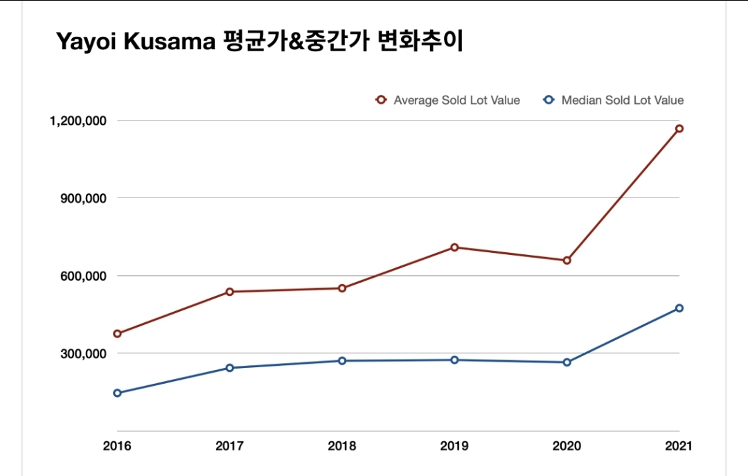 ③ 쿠사마 야요이 작품의 평균가 및 중간가 변화 추이