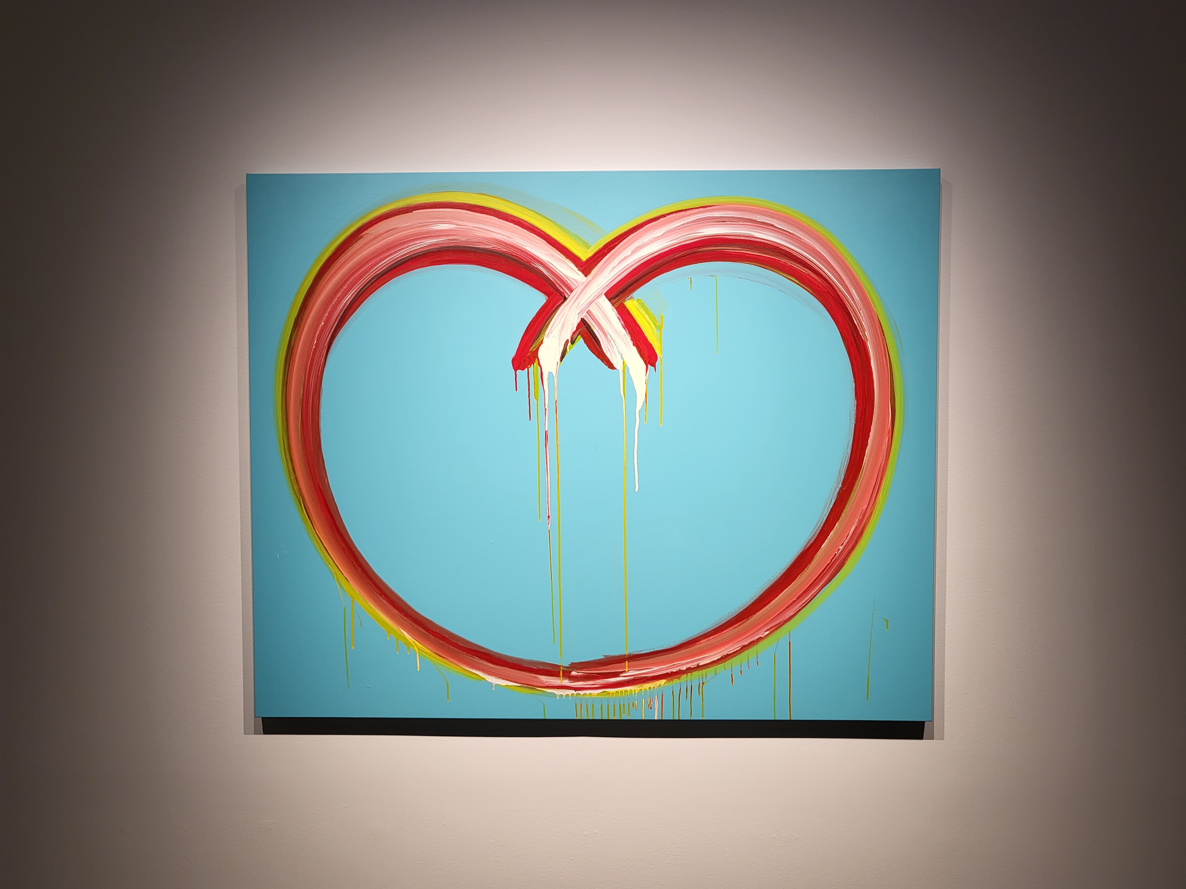 하늘색 배경에 빨간색과 하얀색, 그리고 노란색이 겹쳐진 하트 모양의 작품입니다.