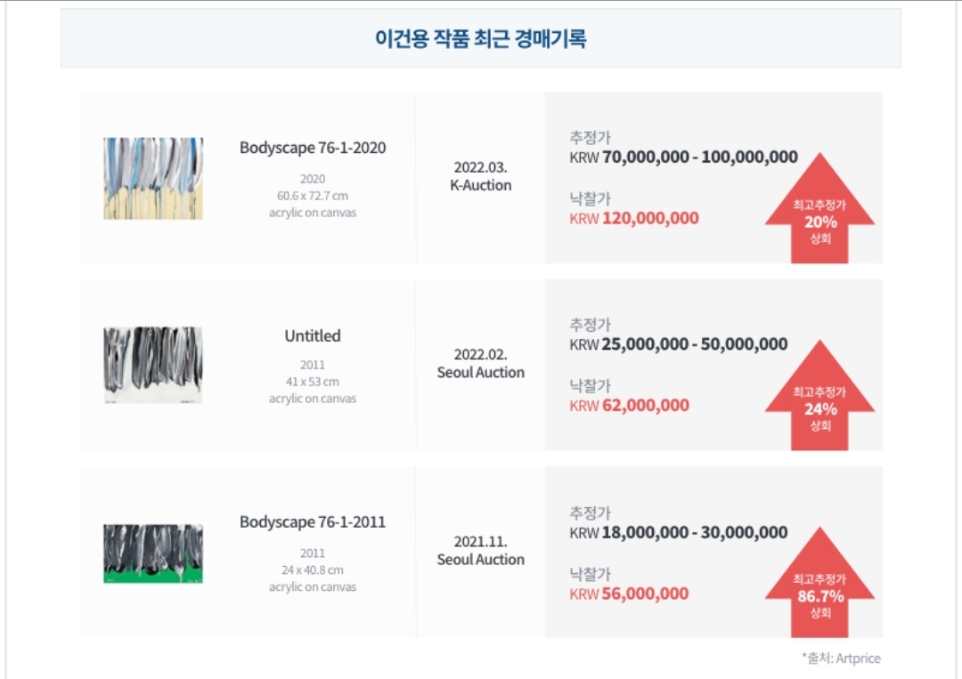 LiveArt 확인 시 이건용 선생님의 아티스트 지수는 지난 5년간 234%입니다.