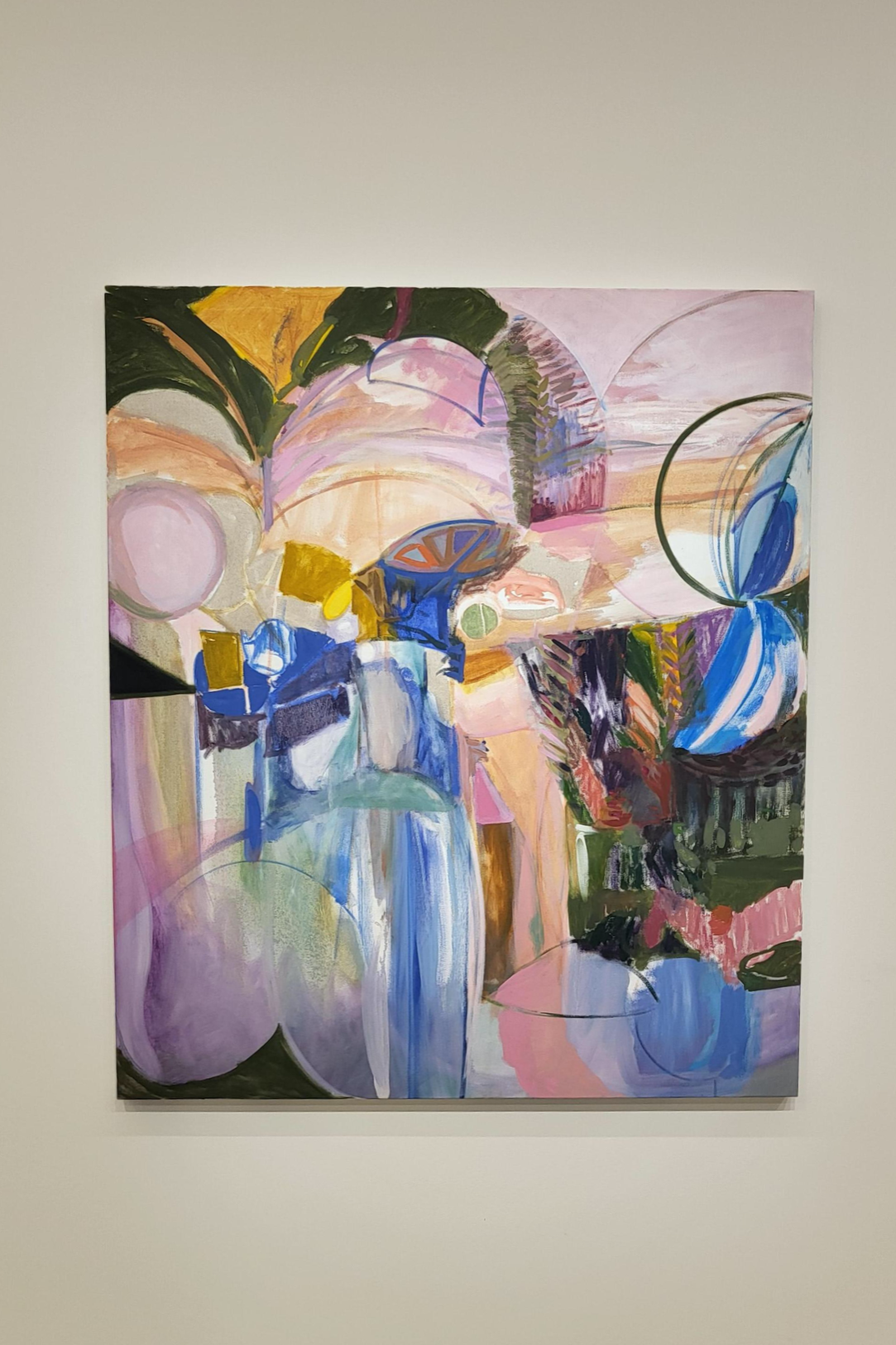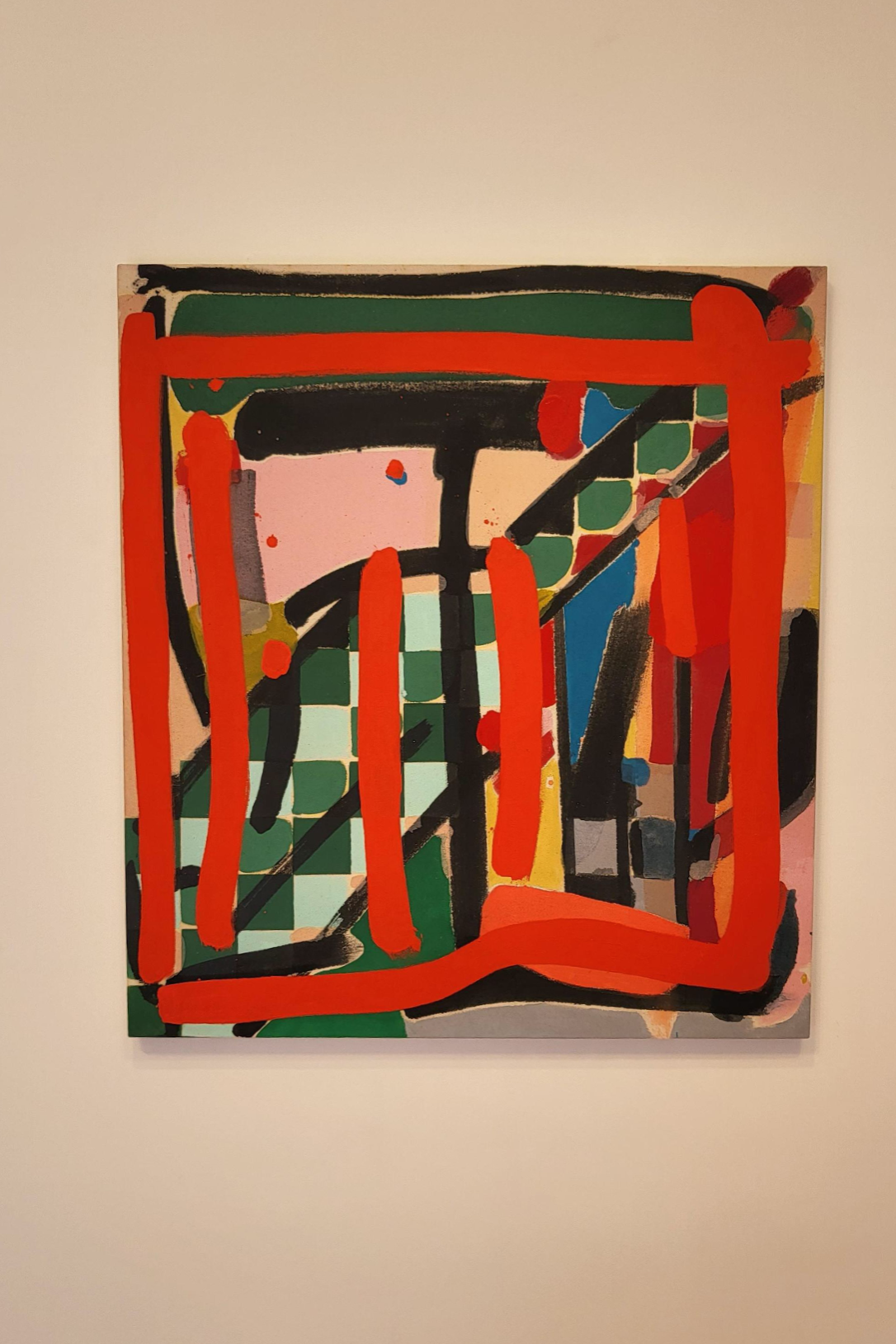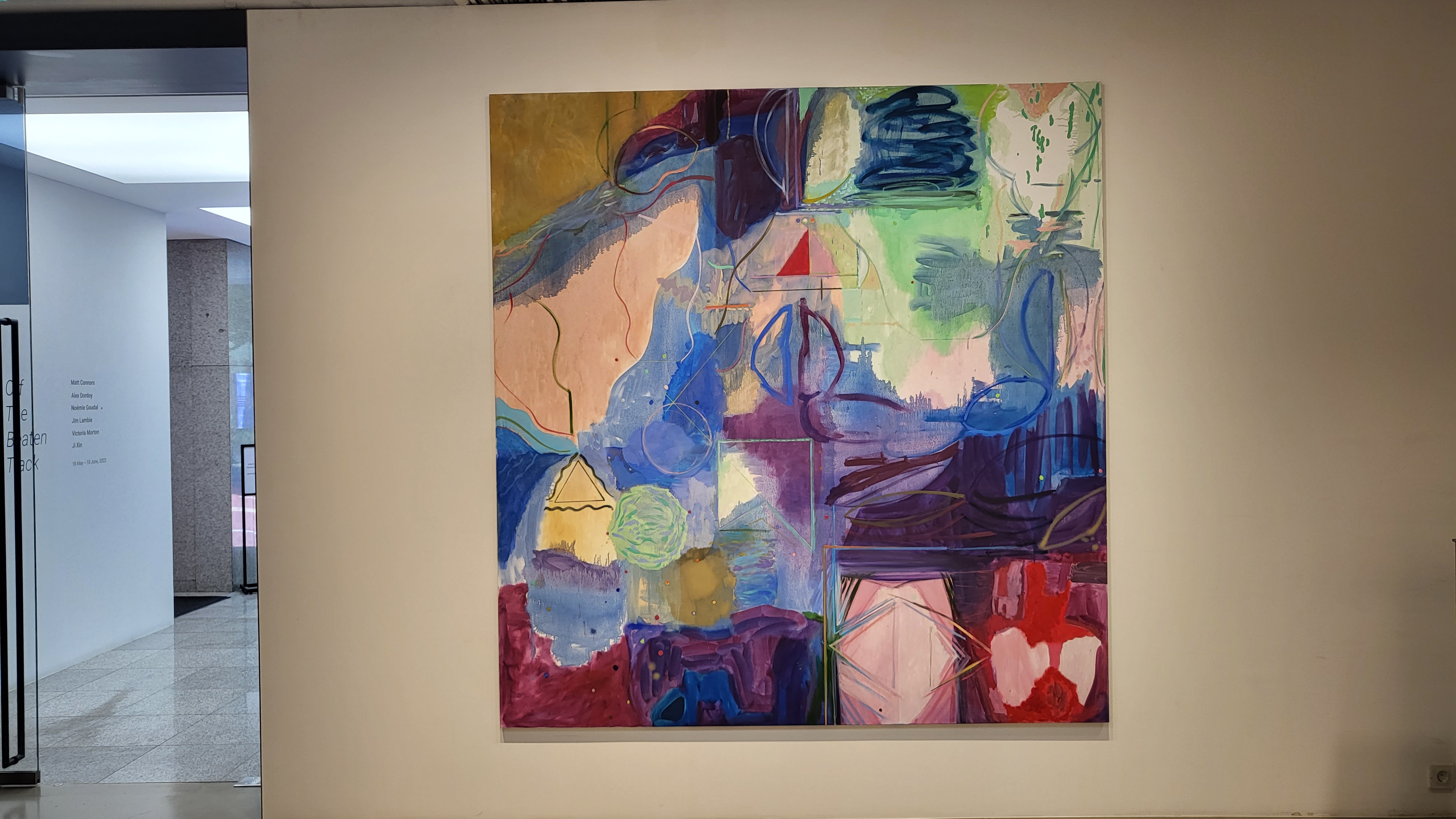 Matt Connors(b. 1973, USA)의 〈Ardent Partner〉 (2022)는 기하학적인 형식과 감각적인 분위기를 구현한다. 적층 구조로 발현된 색들이 창조하는 공간감과 색 선들이 교차하며 캔버스에 부여하는 형식미는, 순수 추상의 영역에 창의적으로 접목한 미니멀한 구성에 대한 작가의 의도를 음미하게 한다. 마치, 색유리와 다양한 철골 구조로 여러 겹 중첩된 외부의 정경을 내다보는 듯한 느낌은 입체적으로 표현된 흩뿌려진 점들과 결합하여 캔버스 전반에 생동감 넘치는 역동성을 가져온다.