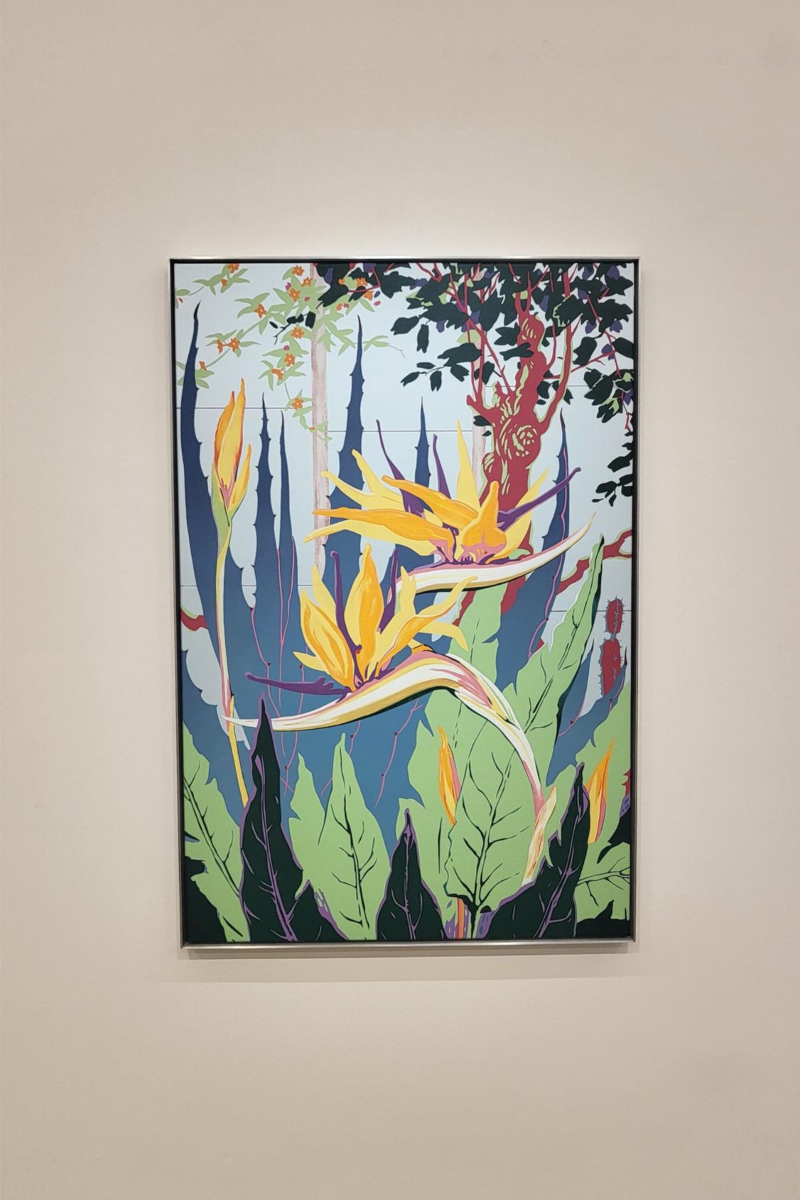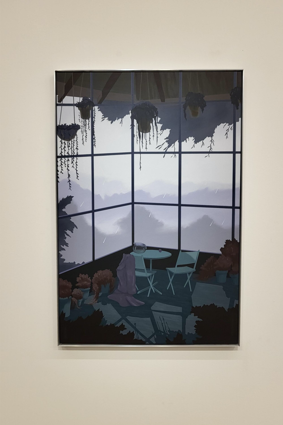 〈The Instinct of Flight〉 (2022)는 먹구름이 낀 하늘을 배경으로 티 테이블이 놓인 창가를 멜랑콜리적이고 낭만적으로 묘사한다. 회색톤의 무채색으로 표현된 식물들은 작품 전반에 보이는 날씨에 대한 암시와 함께 햇빛의 부재를 상징적으로 드러내며, 테이블 위의 티포트와 급히 던져진 듯한 외투가 스산한 분위기를 자아낸다. 반면에 〈Flowers Still for You〉 (2022)에서 작가는 화려한 색상으로 식물을 생기있게 담아내며 눈앞에 열대 풍경을 펼쳐 보인다. 작가 특유의 그래픽적이고 단순한 형태와 그림 안의 영화적인 구성이 대비되며 시적인 효과가 극대화된다.