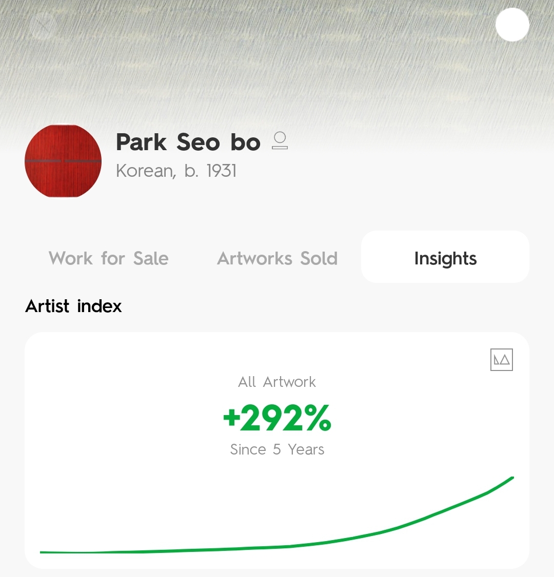 LiveArt 데이터를 확인 시 지난 5년간 박서보 화백의 아티스트 지수가 292% 상승했습니다.