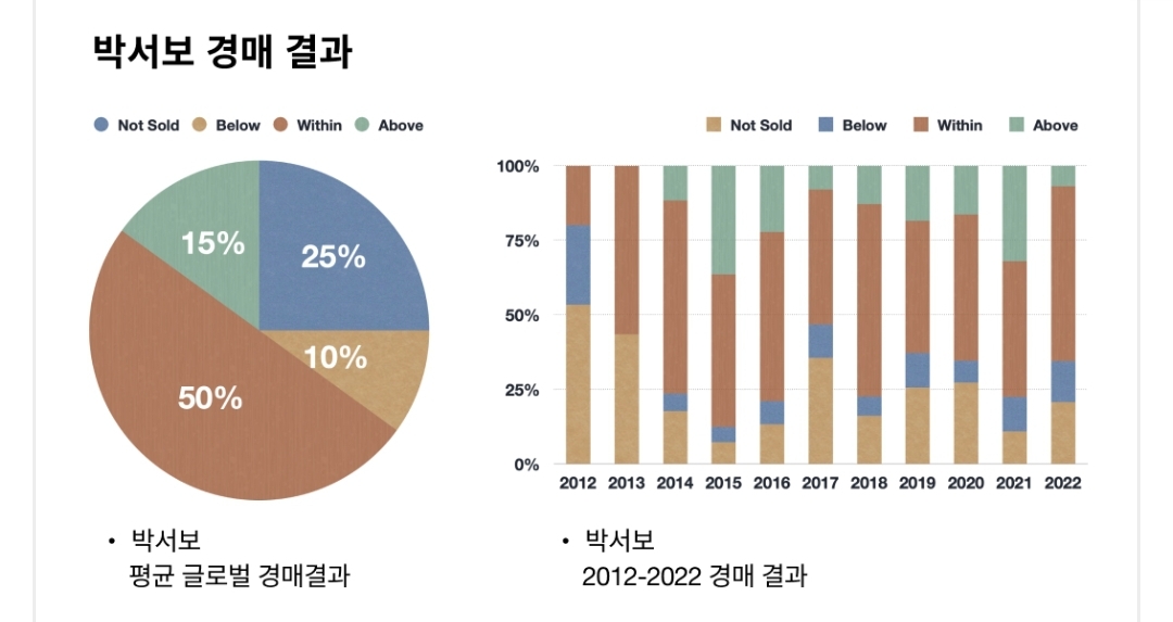 - 페인팅 작품은 4점 판매되었고, 86.6% 거래되었으며, 추정가 대비 62% 높은 가격에 거래 되었습니다.