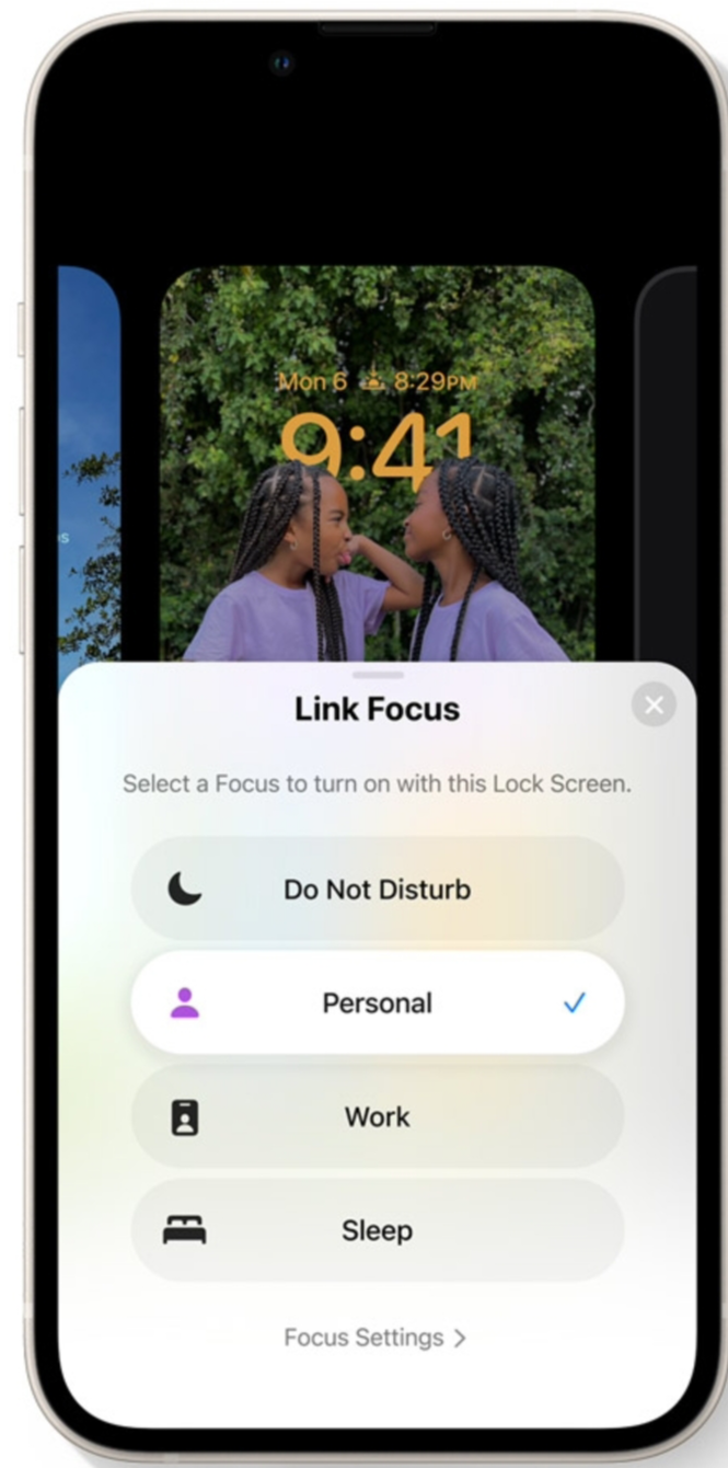 잠금 화면에 집중 모드를 연동해 두면 집중 모드 성격에 따라 달라지는 잠금 화면을 사용할 수 있습니다.