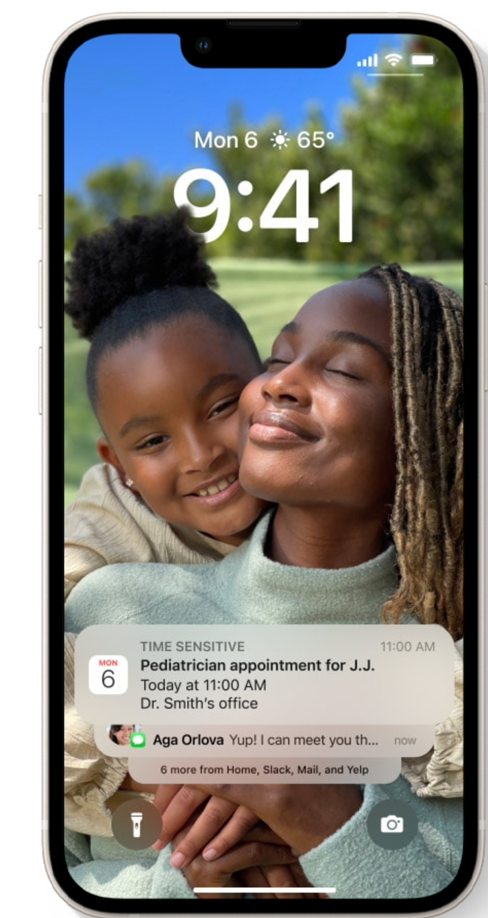 잠금 화면에서의 알림은 중간에 위치하여 정보를 바로 확인 할 수 있도록 했으나, iOS 16부터는 배경 화면을 가리지 않도록 알림을 하단에 배치 했습니다.