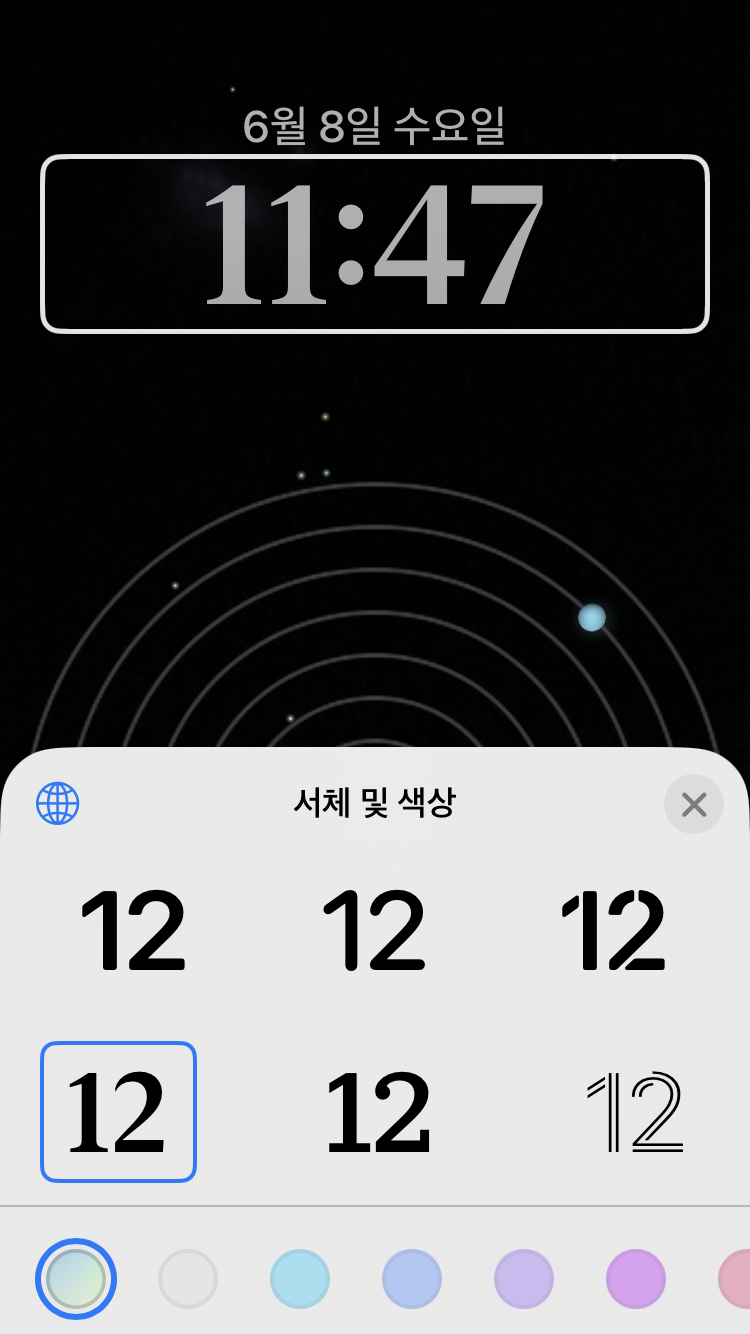 6종류의 시계 스타일(시계 서체)과 컬러를 사용자가 직접 선택할 수 있도록 했습니다.
