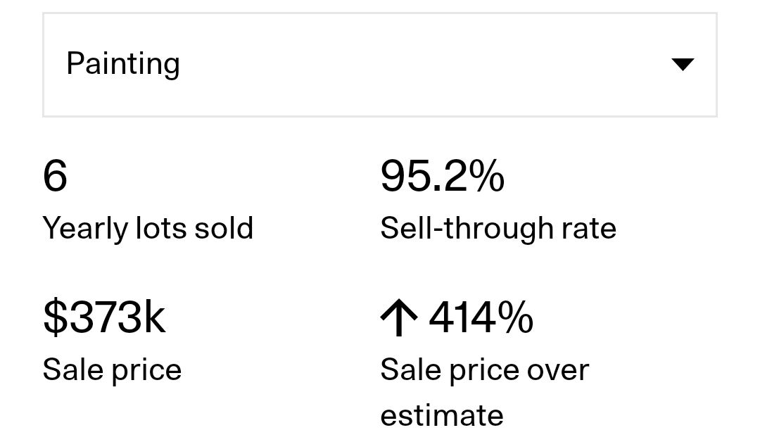 아트시 데이터를 보니 페인팅 작품의 경우 총 6점 판매되었고 95.2%의 판매율을 보이고 있으며 예상 추정 가격보다 414% 높에 판매되었습니다.