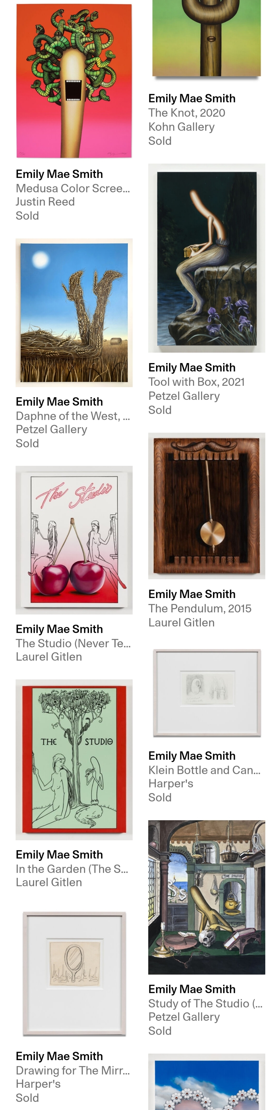 Emily Mae Smith의 매력적인 조형은 초현실주의, 상징주의 및 팝아트의 요소를 뚜렷하게 페미니스트 미학과 융합하고 있습니다. 작가의 유머러스하고 대립적인 그림과 종이 작품에는 디즈니 영화 '판타지아'의 젠더화된 가사 작업을 모두 참조하는 의인화된 빗자루 캐릭터가 자주 등장합니다. 에밀리 매 스미스는 컬럼비아 대학에서 MFA를 받았으며 뉴욕, 로스앤젤레스, 도쿄, 베를린, 브뤼셀 등에서 전시회를 가졌습니다. 그녀의 작품은 휘트니 미술관(Whitney Museum of American Art), 댈러스 미술관(Dallas Museum of Art), 코네티컷 하트포드(Hartford)에 있는 워즈워스 아테네움 미술관(Wadsworth Atheneum Museum of Art) 등 여러 공공 컬렉션에 소장되어 있습니다. 그녀의 그림은 유통 시장에서 7자리(달러 기준) 가격에 판매되고 있습니다. 그녀가 미술사를 되짚어보고 자신만의 독특한 시각적 언어를 발전시키면서 에밀리 매 스미스는 전통적인 남성적인 회화 스타일에 여성적인 내면의 감각을 삽입하고 있습니다.