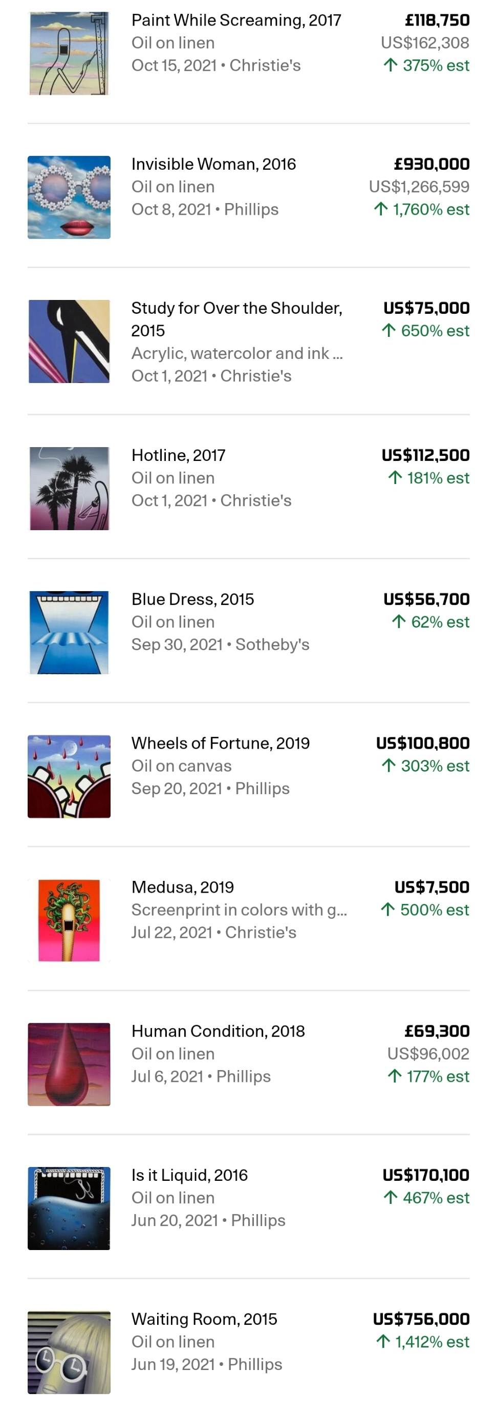 예상 작품 가격 보다 1000% 이상 높은 가격에서 거래된 경우도 보이는데, 그녀의 작품이 현재 예술 시장에서 핫하다고 생각됩니다.