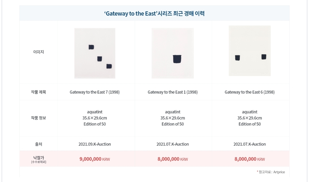 Gateway to East의 최근 경매 이력을 보면 한 점당 800만 원 ~ 900만 원 수준으로 낙찰되었습니다.