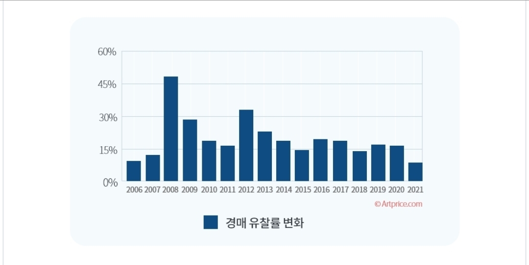 이우환 화백 작품의 거래량도 꾸준히 높은 수준이고 올해 2021년 경매 유찰율도 10% 내외로 많이 낮아졌습니다.