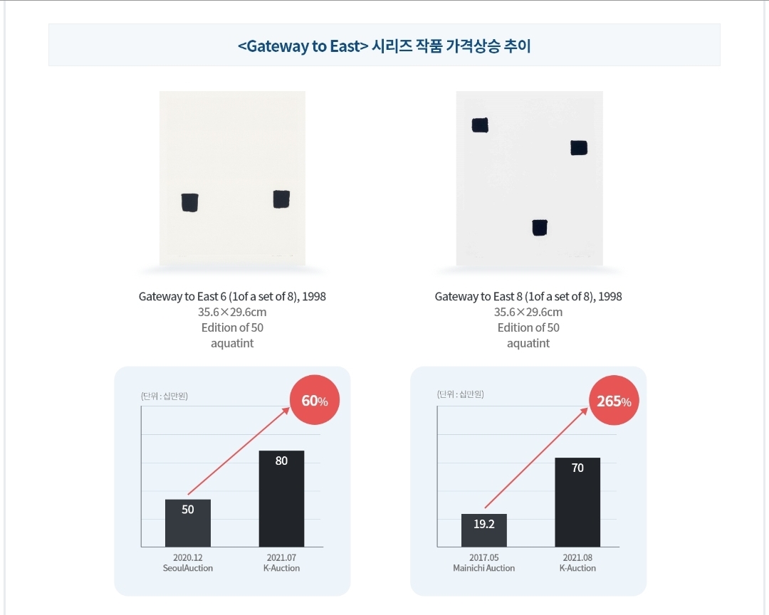 동일 작품 가격 상승률이 60%에서 최고 265%로 높습니다.