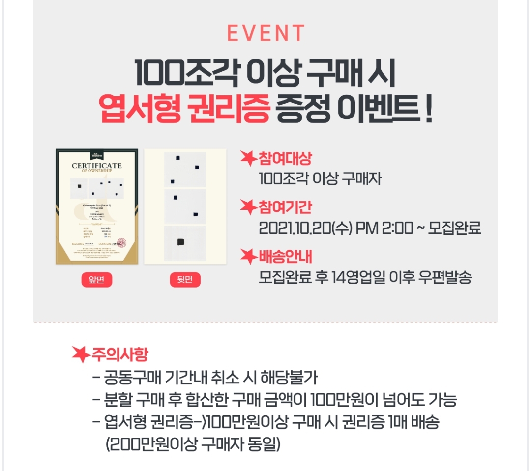 그리고 100조각 이상 구매 시 엽서형 권리증을 증정하는 이벤트가 있으나 저는 소액투자만 하기 때문에 이벤트 내용만 확인했습니다.