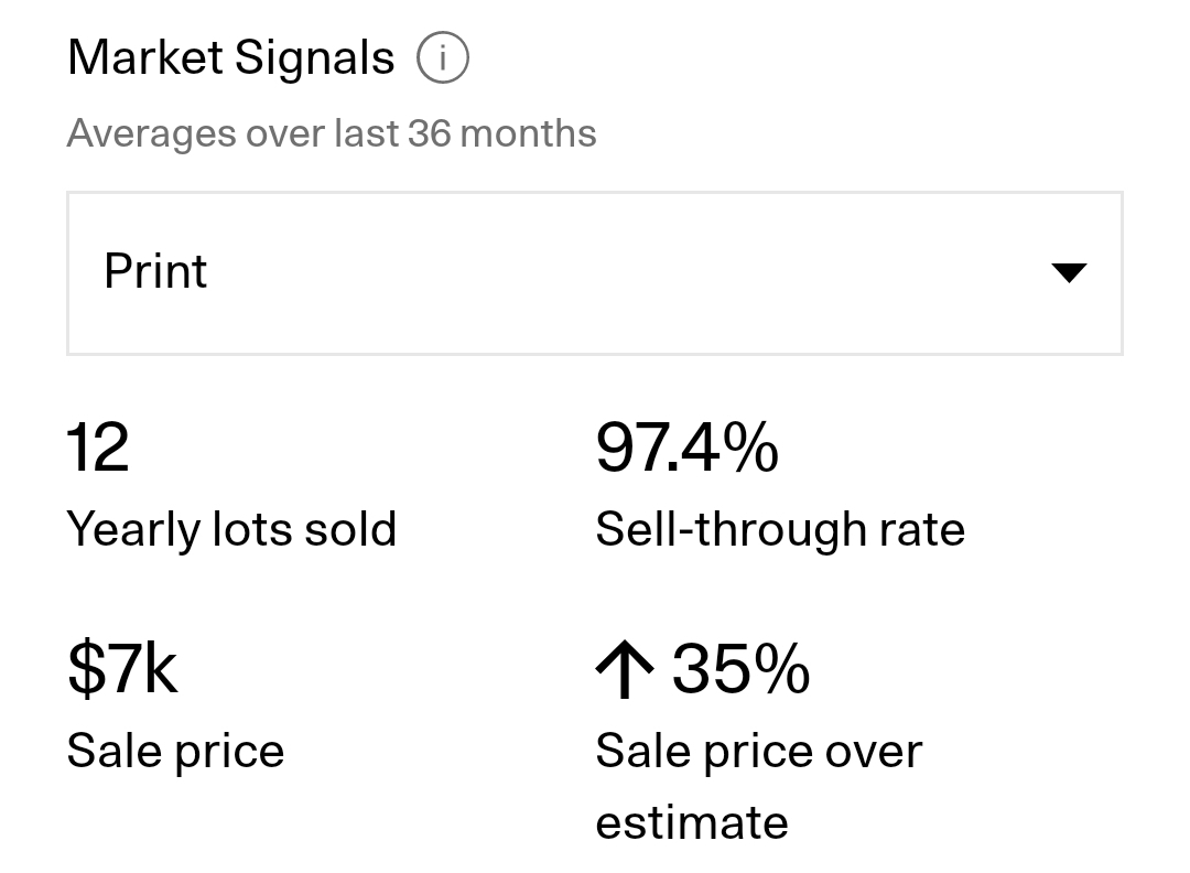 아트시(artsy.net)의 데이터에 따르면 최근 36개월간 12점의 프린트 작품이 판매되었고 97.4%의 판매율을 보이고 있습니다.