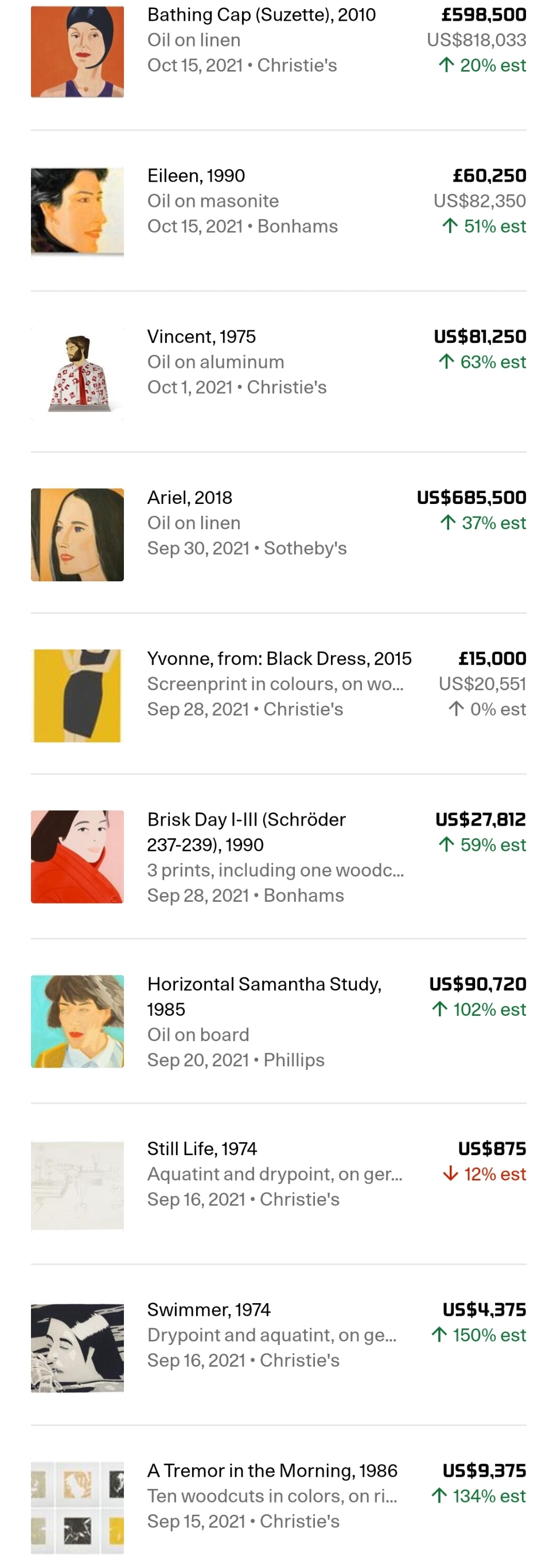 1) 알렉스 카츠의 작품은 2019년 196억이라는 최고 낙찰가를 기록했고 다른 작품들도 지속적으로 가격이 상승하고 있습니다.
