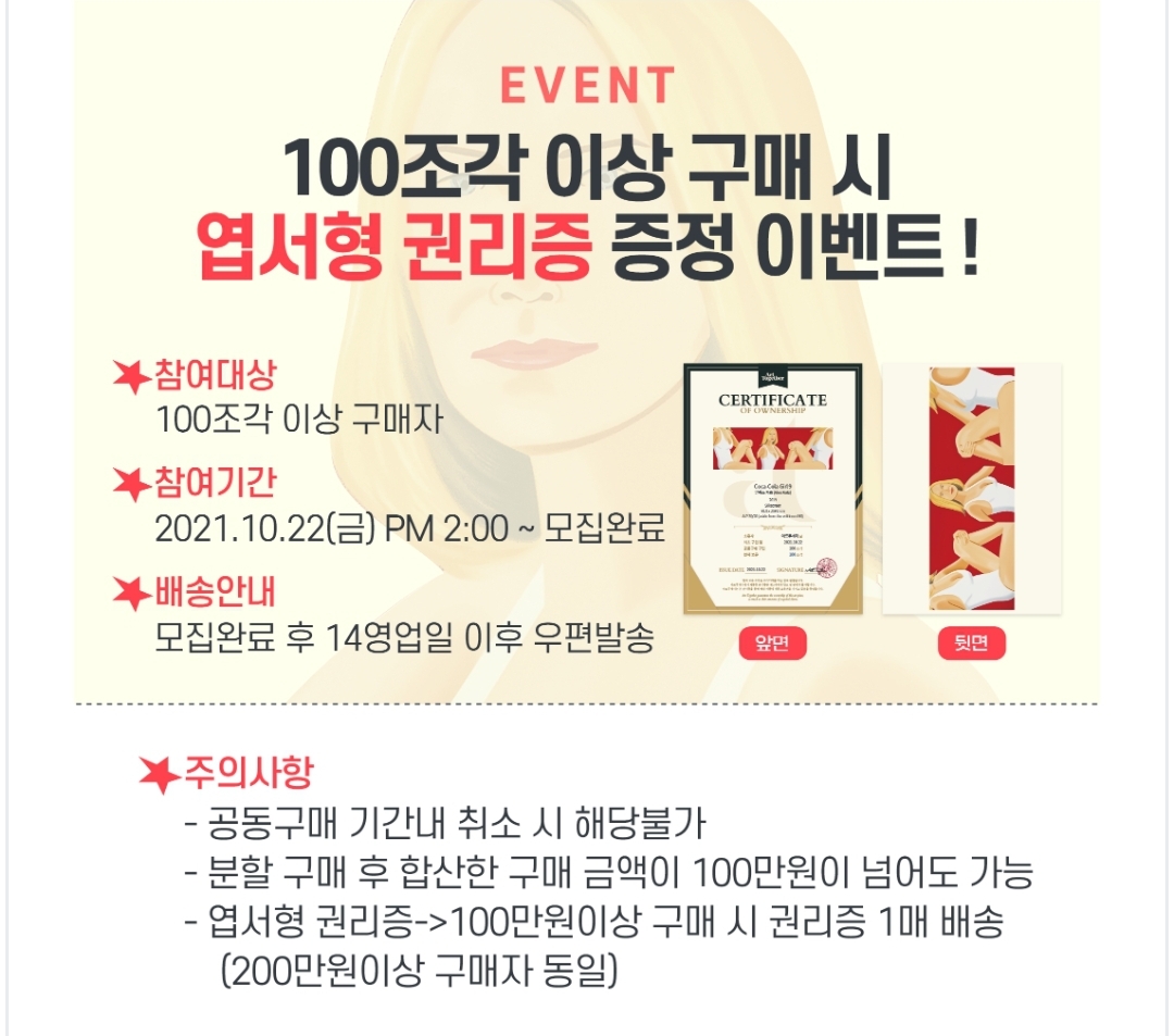 현재 구매후기 이벤트와 100조각 이상 구매시 엽서형 권리증 증정 이벤트가 준비되어 있습니다.