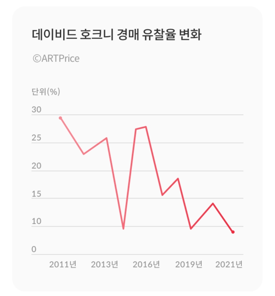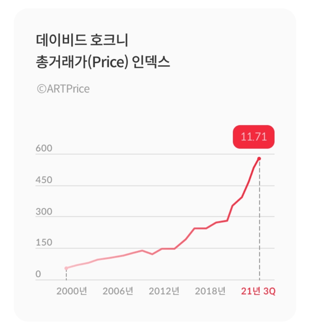 LiveArt에서 제공하는 경매 총 거래가가 20년간 927% 상승했다고 하고, 팬데믹 영향으로 잠시 주춤했었지만 1년만에 24% 이상 상승했습니다. 데이비드 호크니 작품의 수요가 꾸준히 증가함을 알 수 있게 해줍니다.